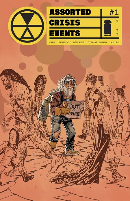 "SERIES PREMIERETime is having a crisis.Mingling in the red-light district, you can find actual cavemen, medieval knights, and cyborg soldiers on leave from World War IV. Victorian debutantes amble their way into cell phone stores, confused and bewildered (what is a data plan?). On their way to work, bleary-eyed commuters get trapped in time-loops, assaulted by alternate-reality versions of themselves, and try to avoid post-apocalyptic wastelands. And LOOK: the 3:15 bus just took a wrong turn…into the neolithic era.Rising stars DENIZ CAMP (20TH CENTURY MEN, The Ultimates) and ERIC ZAWADZKI (House of El) and Eisner-winners JORDIE BELLAIRE and HASSAN OTSMANE-ELHAOU are proud to present** ASSORTED CRISIS EVENTS**, an ongoing, zig-zagging anthology series about the compromised clicks of our clocks—full of one-shot stories both beautiful and ugly, tragic and redemptive, surreal and somehow all too familiar. Stories of people (and reality) in CRISIS—trying to keep it together while the world is falling apart, second by twisted second…"