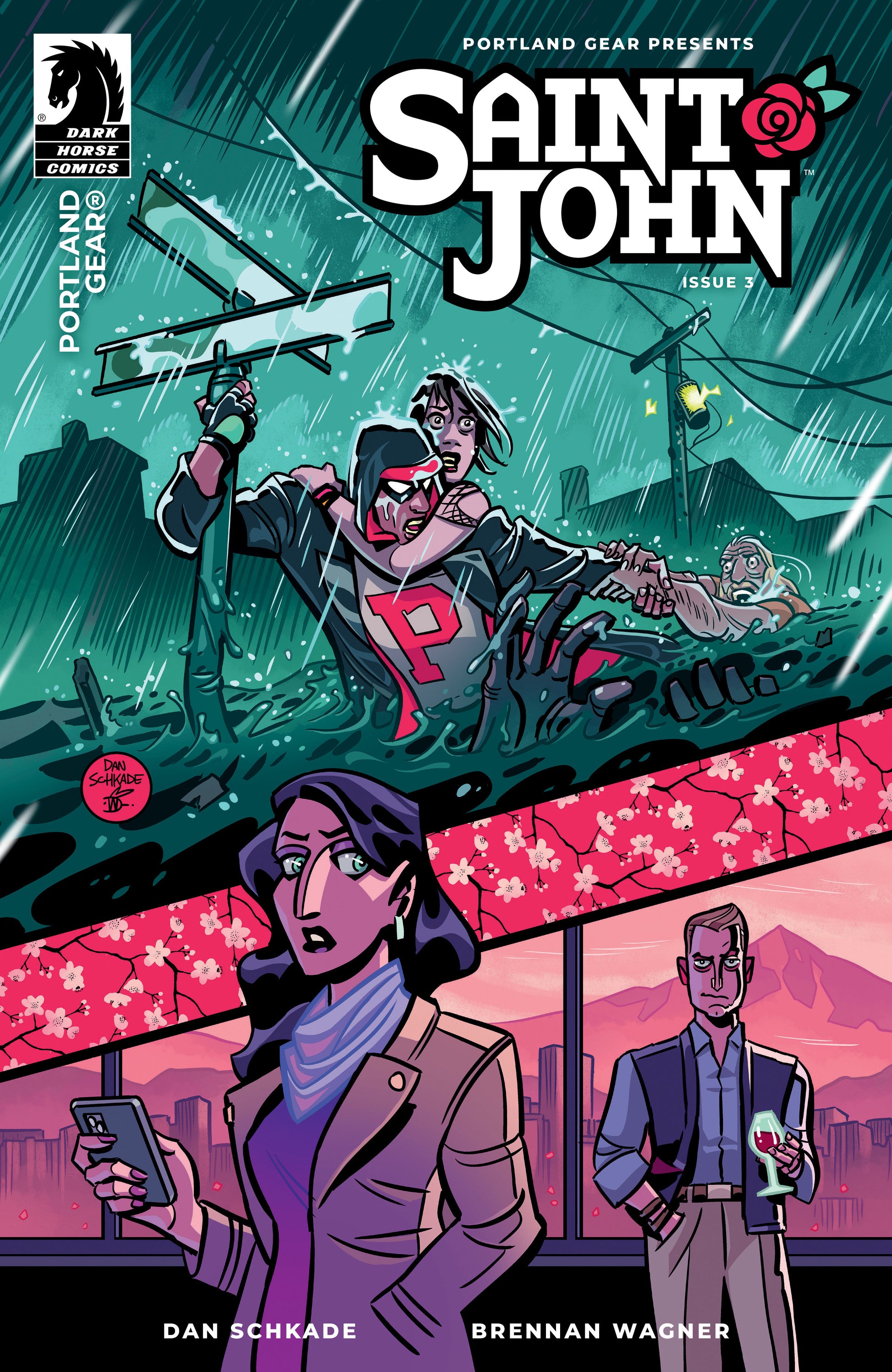 Tori and Saint John are pushed to an emotional fission point as flash floods tear through an eastside neighborhood. While John races against time to pull vulnerable citizens from the deadly rising water, Tori discovers Felix Hodge’s true vision for the future of Portland. A distinctly PDX miniseries from Eisner-nominated cartoonist Dan Schkade (Lavender Jack, The Spirit) and Portland native creator Brennan Wagner (Grendel, Batman), produced with—and featuring the fashion of—Portland Gear.