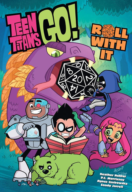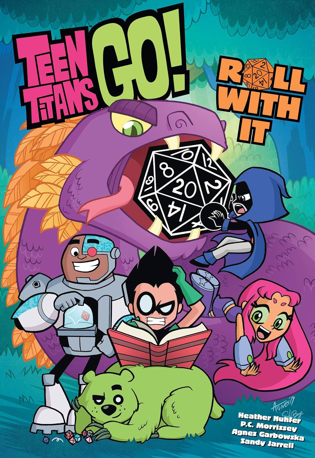 Heather Nuhfer and P.C. Morrissey team up in this fun story about game night with the Titans! The Titans have a regular game of Basements and Basilisks, but when the basement boss (Robin, of course) tries to make the game super fun by making it super-impossible to win, the team rebels. Their new BB is much more fun-and she actually lets them complete their quests, which is excellent motivation to keep playing. But the Boy Wonder begins to worry that the Titans will be trapped in their imaginations forever, going on endless, easy-breezy quests, neglecting their duties in Jump City. There might also be problems with the campaign's most important relic, the "Anklet of Extreme Crushing (and Chafing)," which Robin has tightly clasped to his leg. Characters: Creators: Series: Teen Titans: Go Roll With It